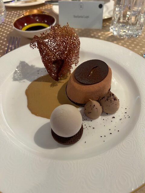 La cena, all’insegna dei sapori italiani, è stata preceduta da un’aperitivo (tra cui una degustazione di Parmigiano Reggiano accompagnata da una selezione di miele e marmellata), è stata realizzata da Ciro Petrone, Culinary Director del Regent Hotel, che ha proposto in menù (con scelta tra carne pesce), risotto allo zafferano con Parmigiano Reggiano e cotechino glassato, merluzzo nero in crosta di limone di Amalfi, mousse di sedano rapa, carote glassate e salsa al vino vermentino.