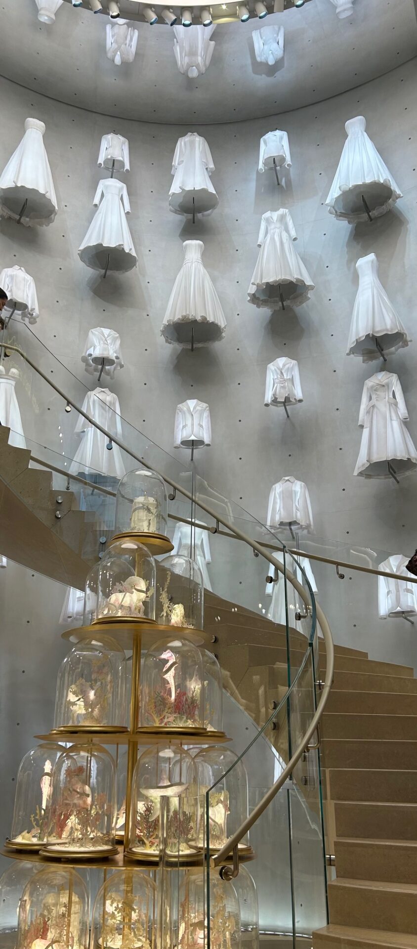 Appena varcata la soglia, si è abbagliati dall’immensa parete di vetro del Diorama che circonda le scale, dove appare un arcobaleno di 1874 miniature in 3D che racchiudono gli abiti e gli accessori Dior più iconici.