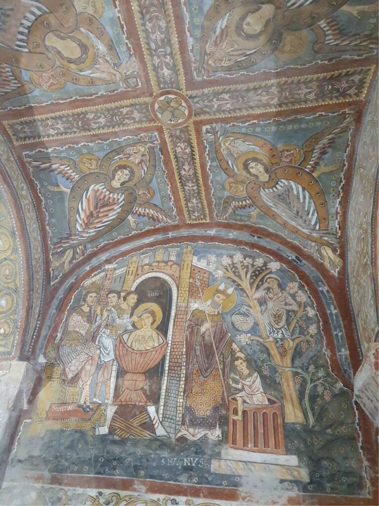 Il vero gioiello della cattedrale, tuttavia, si trova nel livello inferiore: la celebre cripta di San Magno, considerata uno dei cicli pittorici medievali più affascinanti d’Europa. Le pareti sono interamente ricoperte da affreschi del XIII secolo che raccontano scene bibliche, simboli cosmologici e figure allegoriche.