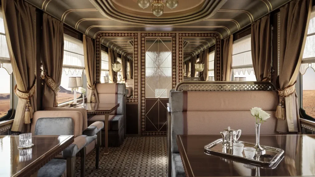 Gli interni richiamano le tonalità calde del deserto, con legni intagliati, dettagli dorati e materiali ricercati che creano un’atmosfera elegante e immersiva. Le carrozze ristorante offriranno menu d’autore firmati da chef sauditi e internazionali, trasformando ogni viaggio in un’esperienza gastronomica di alto livello.