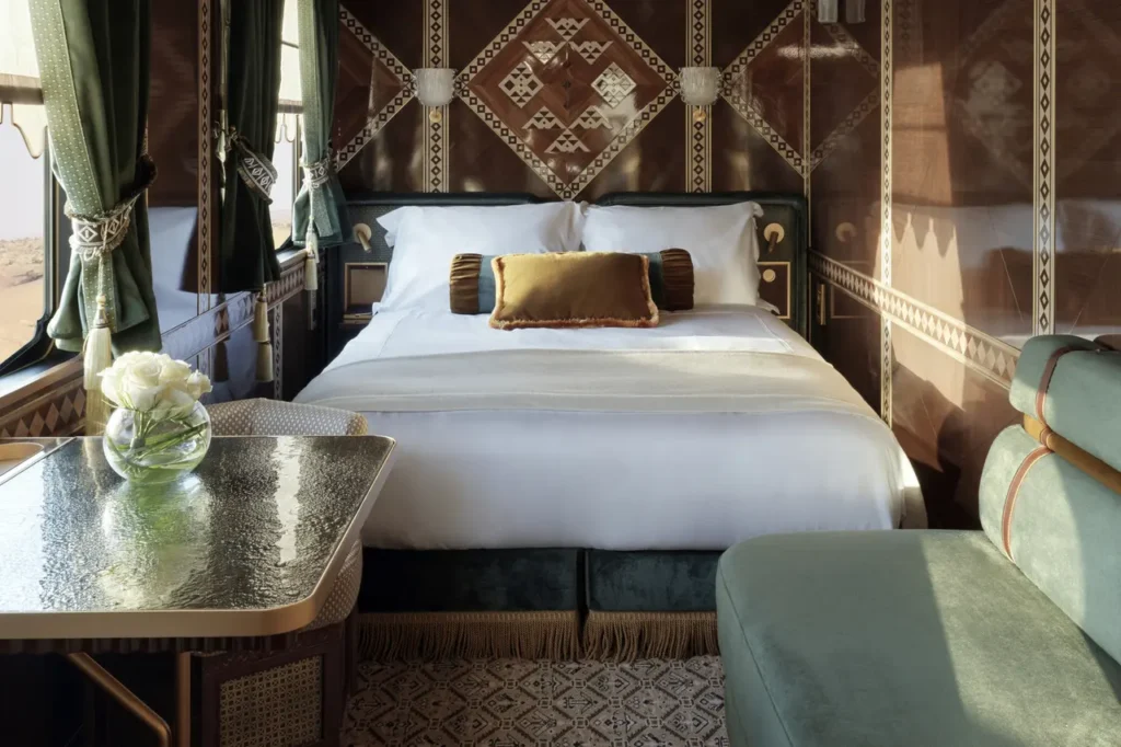 Dream of the Desert si distingue per un concept raffinato e un’attenzione maniacale ai dettagli. Il convoglio sarà composto da 31 suite private e 2 suite presidenziali, accogliendo un massimo di 66 ospiti. Completeranno l’esperienza due carrozze ristorante e una lounge Majlis, pensata come luogo d’incontro e relax.