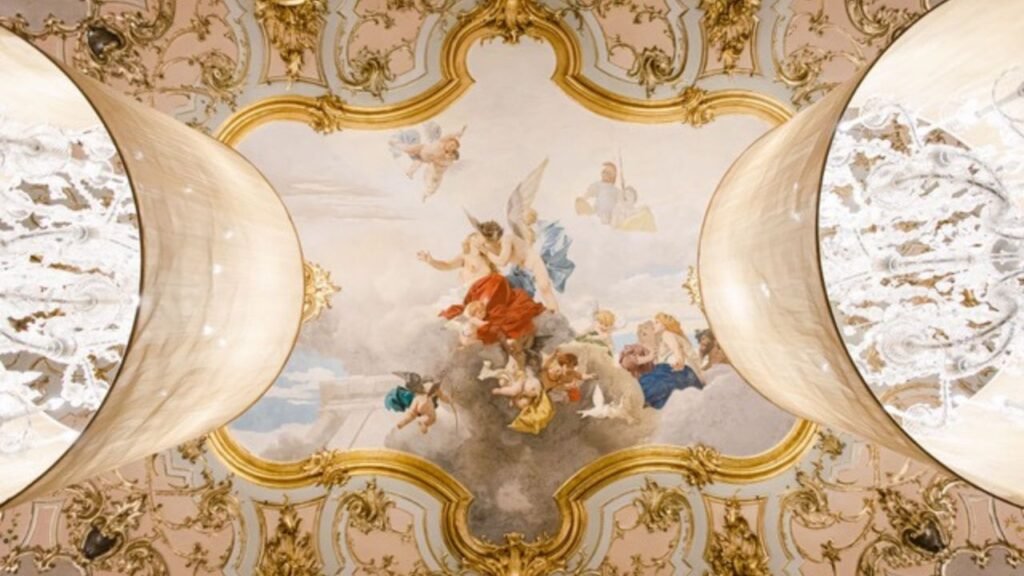Ad accogliere gli ospiti è la magnifica Sala degli Specchi, autentica sala da ballo decorata con stucchi barocchi, affreschi originali e preziosi riflessi dorati che amplificano la luce calda del tardo pomeriggio.
