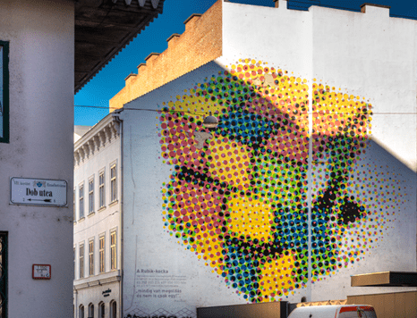 Arrivati a Kazinczy Street, famosa per i suoi murales colorati, è possibile ammirare l’opera “Rubik’s Cube” di Neopaint Works, una delle più amate, suggerisce la soluzione del famoso puzzle creato dall’ungherese Erno Rubik.
