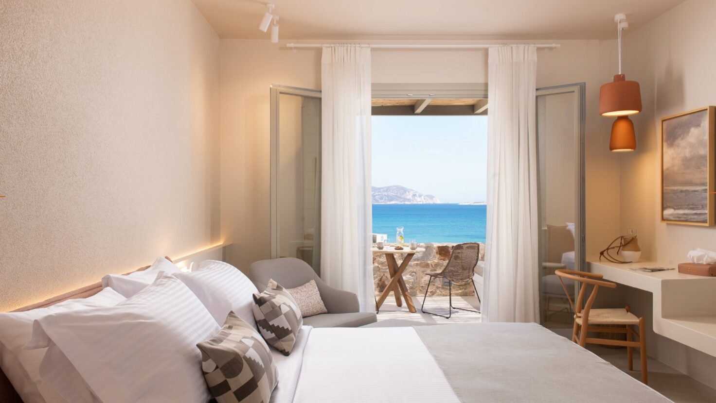 Sunrise Escape Suites (28 m²): affacciate direttamente sul mare, permettono di svegliarsi con il suono delle onde. Linee minimaliste e comfort moderni rendono l’esperienza semplice ma raffinata.