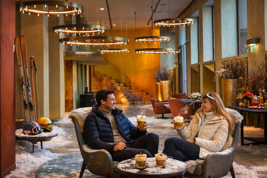 Durante l’Après-Ski Milano, gli spazi interni degli hotel vengono ripensati con allestimenti ispirati alla montagna: materiali caldi, dettagli in legno, luci soffuse e scenografie immersive che richiamano le baite alpine.
