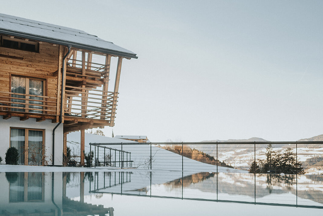 All’esterno si apre la piscina infinity riscaldata, affacciata sul Castello di Presule e sull’Altopiano del Renon, che offre una vista unica in ogni stagione.