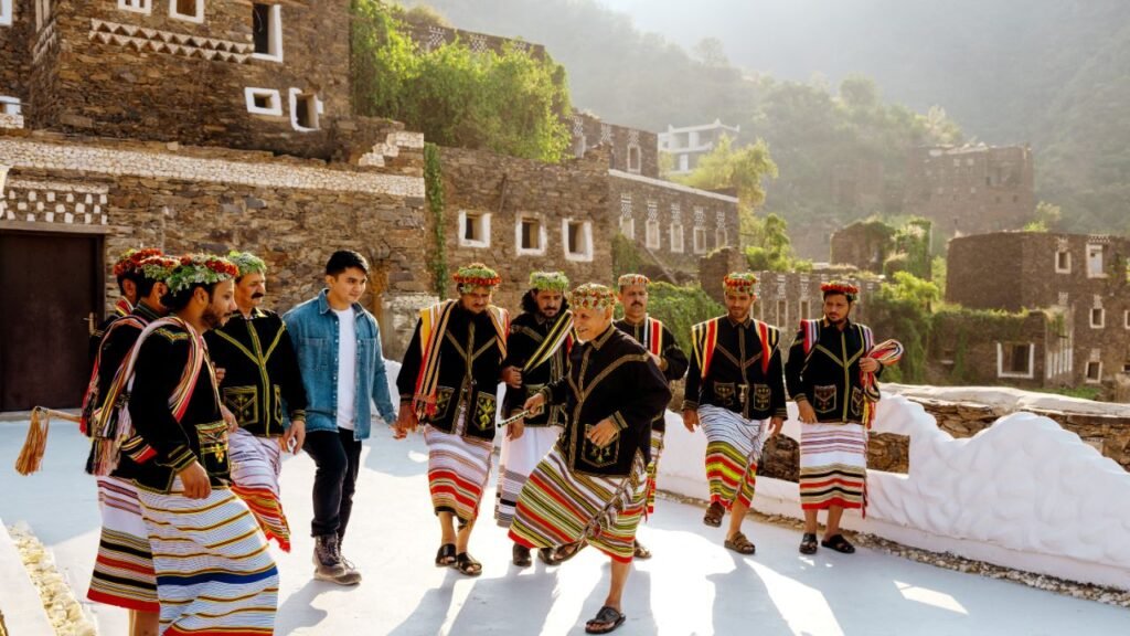 Aseer è una terra in cui le tradizioni vivono ancora oggi attraverso i suoi abitanti. Qui si possono incontrare i celebri “Flower Men”, uomini appartenenti a tribù locali che indossano spettacolari corone di fiori ed esprimono la loro identità attraverso flauti e danze tribali. Un’altra espressione culturale tipica è l’Al-Qatt Al-Asiri, un’antica arte decorativa realizzata dalle donne su pareti e arredi domestici, oggi celebrata anche in un museo dedicato.