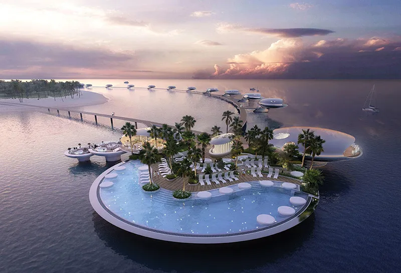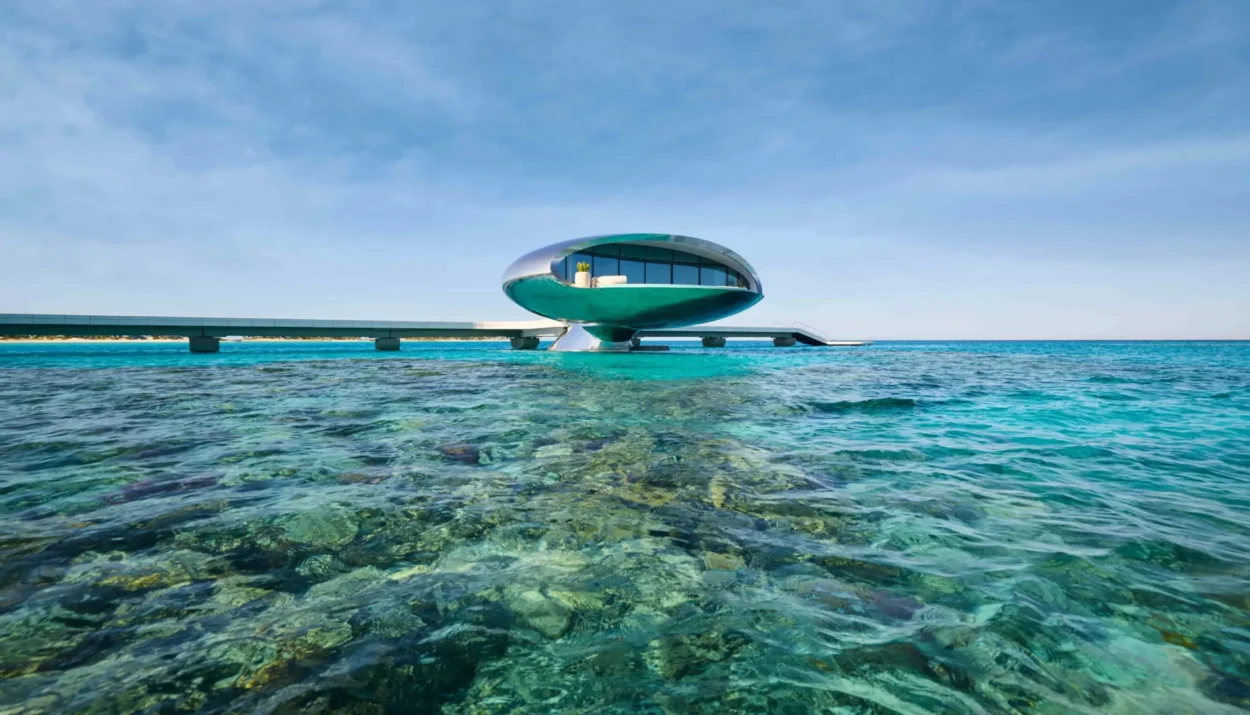 A circa un’ora di auto dall’aeroporto, attraversando il ponte sull’acqua più lungo dell’Arabia Saudita, si raggiunge Shura Island, il cuore pulsante della destinazione. Conosciuta come “Coral Bloom”, ospita 11 hotel ultra-lusso firmati Foster + Partners, ispirati alle forme delle barriere coralline.