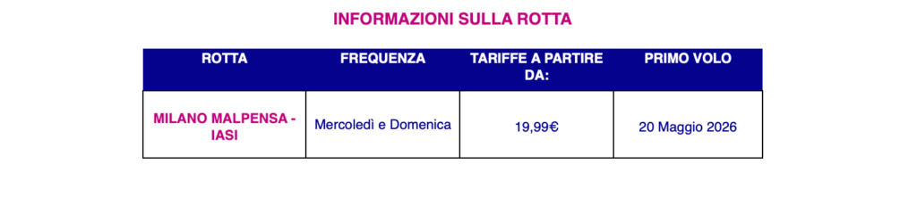 La nuova rotta Milano Malpensa – Iași sarà operativa a partire dal 20 maggio, in occasione della stagione estiva. Il collegamento prevede due frequenze settimanali, ogni mercoledì e domenica, una programmazione pensata per favorire short break e long weekend.